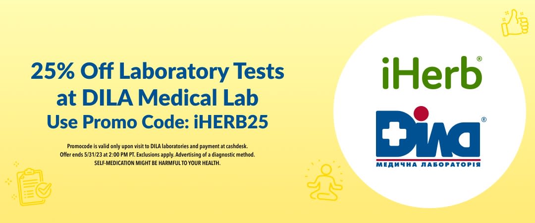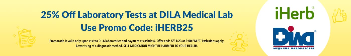 Під час візиту до будь-якого відділення ДІЛА назвіть касиру при оформленні замовлення промокод iHerb25 (Айхерб25) та отримайте знижку 25% на всі дослідження, окрім Алергопанелі.